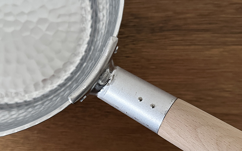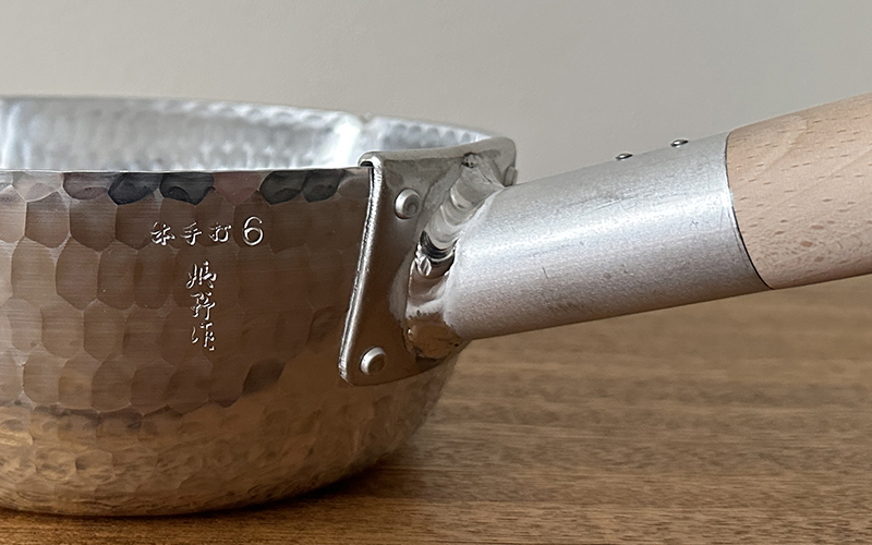 平らなアルミ板は手で簡単に曲げられるほど柔らかい素材です。それを叩き締めることで手では到底曲げることができないほど硬い素材へと変化します。この叩き締めて出来た表面の凹凸を槌目と言います。職人技でしかなし得ないこの技術は、人の手から作り出されたとは思えないほど綺麗な雪の結晶のような形が連なります。槌目の役割は意匠と硬化だけではなく、鍋肌の表面積が広がることで、熱伝導が向上して、火の通りが早くなり、食材に熱が均一に伝わります。行平鍋をひとつ作るのに800〜900回ほど叩いて仕上げています。特に大事にしているのは、鍋底の立ち上がり部分である角です。僅か1cmの幅に金槌で4段もの槌目を入れて叩き締めることで、耐久性に優れた丈夫な鍋に仕上がります。工房では日々カンカンカンと鍋を叩くリズミカルな音が響き渡っています。