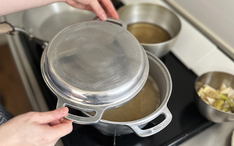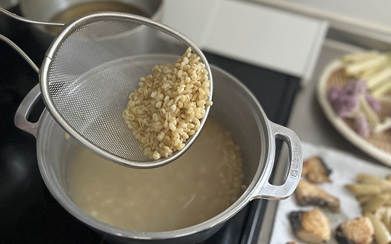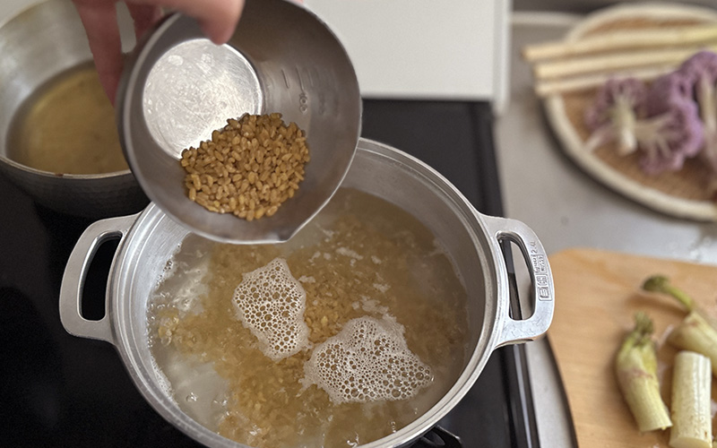 1.鍋に1Lほどの水を入れて強火にかけます。沸騰したら弱火にして、ブルグル100gと塩少量(分量外)を入れて蓋をして12〜15分茹でます。ブルグルがふっくらしてきたら、火を止めて10分ほど蒸らします。蒸らし終えたらザルに上げ、水気を切っておきます。ブルグルはメーカーによって使用方法が異なります。お使いの商品の表示通りに茹でてください。全粒の香りが苦手な方は、茹でる前にフライパンで少し炒ってからお使いください。