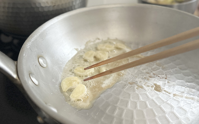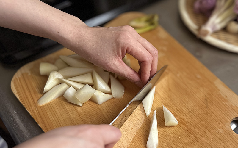 2.ウドは太い茎、脇の茎、穂先に切り分けておきます。さらに太い茎は節で切り分け、皮の周りはアクが強いので厚めに剥き、乱切りにしておきます。切り口が変色しやすいので、400ccの水に酢小さじ1を入れた酢水に10分ほどさらします。フライパンにオリーブオイルを入れて熱し、水を切ったウドと塩少々を入れて炒めます。1.で茹でてザルに上げておいたブルグルは、水気をさらに和晒で良く切ります。
