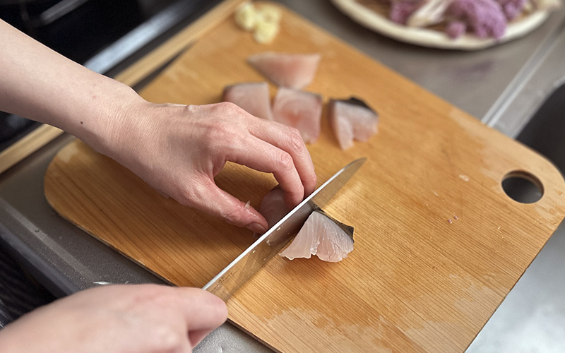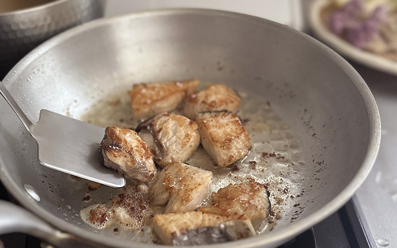 3.にんにくはスライスし、鰆は1切を4つに切り分けます。フライパンにオリーブオイルとにんにくを入れ、中火にかけます。香りがしてきたら、鰆を入れてこんがり両面を焼きます。最後にバターを入れてよく絡めます。カリフローレは、鍋に水と塩少量(分量外)を入れて沸騰させ、2分ほど茹でて水気を切っておきます。お皿に全てを盛り付けて出来上がります。