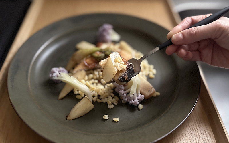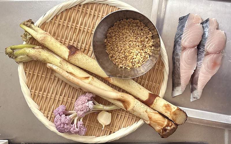 今回は旬の鰆とウドを使ったにんにくの効いたひと皿をご紹介します。トルコの国民食であるブルグルと一緒に食べるので、ブランチならこのひと皿で十分満足できる一品です。シンプルな味付けですが、それぞれの素材を混ぜながらお楽しみください。プチプチとしたブルグルの食感、コリコリとしたウドとカリフローレが絶妙な旨さを引き出します。